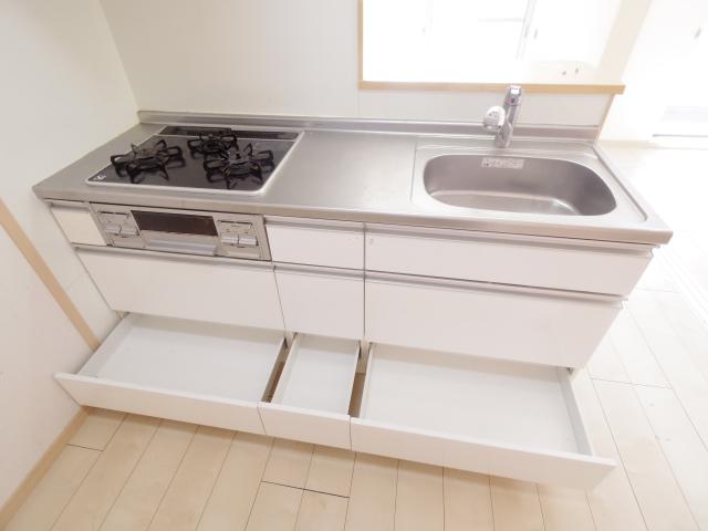 対面キッチンやシステムキッチン☆彡3口コンロ完備(#^.^#)エアコンも浴室乾燥機も完備しちゃっております♪全室洋室でお部屋のレイアウトも楽しみですよね☆静かな環境もおすすめ~☆彡ぜひご覧くださいね。